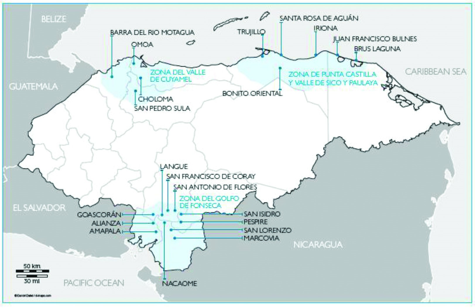 Para el 2012, ya se habían definido la localización de las primeras RED; estas se ubicaron estratégicamente cerca de las costas y en varios lugares donde ya existía una base previa de explotación agrícola, industrial o comercial. Dichas zonas fueron tres: la zona del Valle de Sula, la zona del Golfo de Fonseca y la zona de Punta Castilla y Valle de Sico y Paulaya (Figura 9). La definición de esta última zona RED, la cual es ampliamente habitada por la población garífuna hondureña, hizo que las organizaciones de derechos humanos y a la comunidad indígena del país reaccionaran e “interpusieron 68 recursos de inconstitucionalidad y una acusación por traición a la patria en contra de los 126 diputados. En octubre 2012, el pleno de la Corte Suprema de Justicia se pronunció con 13 (de 15) magistrados en contra” (Equipo Nikzor). Después de estos sucesos, las iniciativas para impulsar las RED se ralentizaron, hasta que en el 2013 evolucionaron para convertirse en las ZEDE.