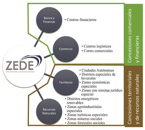 De acuerdo con la Ley de las ZEDE, estas han sido creadas “con el propósito de acelerar el cumplimiento de las metas del Plan de Nación y facilitar condiciones que permitan al país la inserción en los mercados mundiales bajo reglas altamente competitivas y estables” (Congreso Nacional de Honduras, Ley Orgánica A57). La misma Ley proporciona los tipos de zonas que pueden generarse, gracias a esto se puede crear una clasificación de estas, hasta agruparlas en cuatro grupos de concesión que pueden otorgar las ZEDE. Este tipo de concesiones son para aprovechamiento de: banca y finanzas, comercio, territorio y recursos naturales. Como se puede apreciar en la Figura 10, los cuatro tipos de concesiones que se logran con las ZEDES pueden categorizarse a su vez en dos tipos de concesiones: