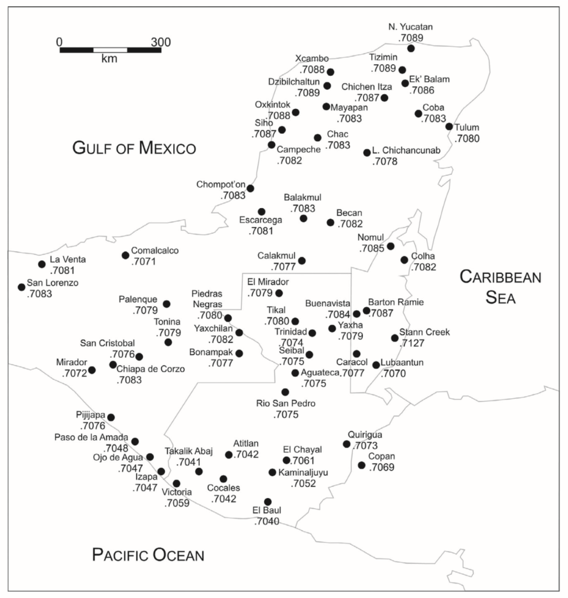 De acuerdo con patrones resultantes de recientes análisis isotópicos en tumbas mayas de Copán, se ha comprobado que existe un interesante número de élites enterradas en esta ciudad que no fueron locales. Dicho estudio analizó los restos de dos gobernantes dinásticos en el sitio donde se descubrió que estos nacieron, a una gran distancia de Copán; vinieron de las tierras bajas mayas. Algunos de sus sirvientes y otros individuos enterrados cerca de ellos tampoco eran originarios de Copán (Price et al.). Los resultados refuerzan la teoría explicada por el profesor William Fash años atrás, quien indica que el predominio de los gobernantes nacidos en el extranjero ha llevado a la idea de que Copán dinástico fue fundado como un “enclave de élite” lejos de los centros mayas (Citado por Price et al. 45). Esta independencia se puede apreciar geográficamente en el mapa de línea base de isótopos de estroncio disponibles en el área maya, el cual se muestra en la Figura 2.