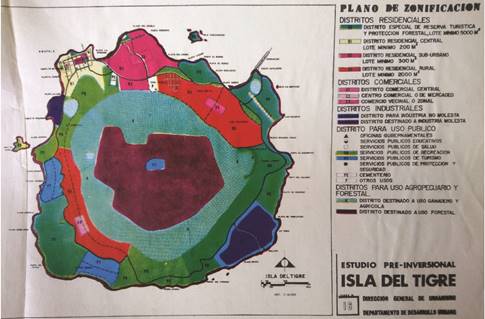 En un intento por revivir la pasada gloria obtenida con el primer enclave en el Pacífico hondureño, en los inicios de la década de los ochenta del siglo XX, el gobierno de Honduras diseñó y propuso un estudio preinversional para la Isla del Tigre, el cual es, hasta la fecha, el único caso hondureño concreto de planificación de un enclave a través de un estudio y un plan de desarrollo previo a su instalación. Dicho plan de desarrollo proponía zonificar a la isla del Tigre en cinco distritos: residencial, comercial, industrial, uso público y agropecuario/forestal (Figura 6) según los modelos de planificación y desarrollo urbano imperantes en esa época.