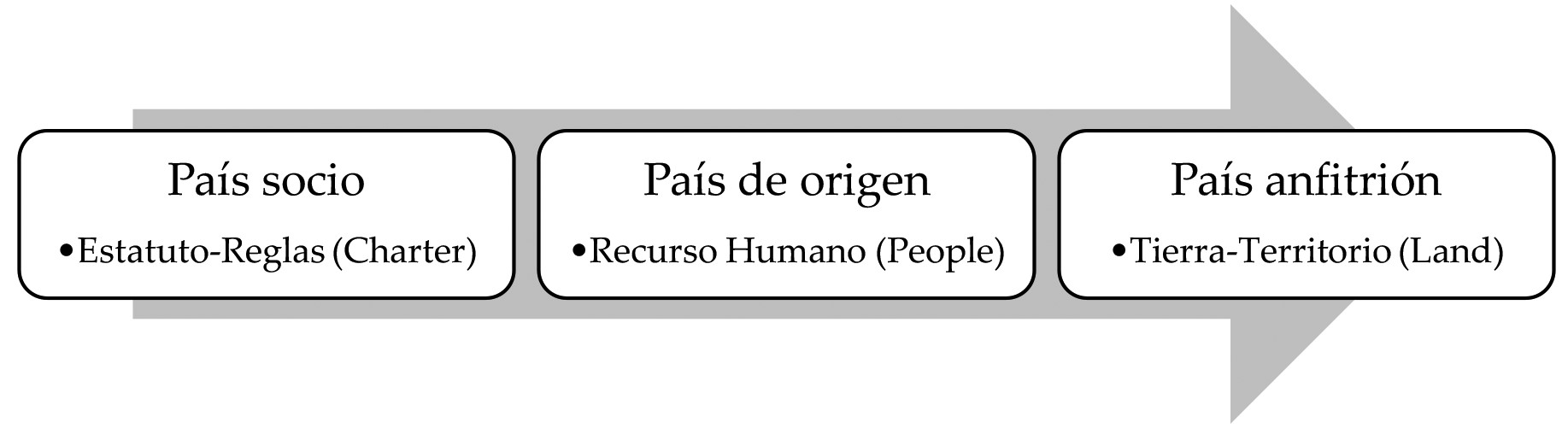 Podemos intuir que el modelo de ciudad chárter muestra que la única manera en que el “Know How” puede transmitirse, para lograr de forma efectiva la prosperidad económica y el Estado de derecho del país anfitrión, es por medio de la aplicación del “aprender haciendo” en la tierra del “país anfitrión” y bajo la gestión absoluta del “país socio”, para garantizar que el estatuto o reglas (chárter) sea respetada y aplicada durante las décadas necesarias para lograr resultados satisfactorios. Igualmente, se requiere recurso humano de un “país origen” calificado para llevar a cabo los proyectos que la ciudad chárter establezca. Esta relación entre actores del modelo se puede representar en el esquema de la Figura 7, basado en los tres distintos roles de las naciones participantes en el modelo, donde cada rol es precedente del anterior y donde cada uno cumple un papel que complementa al otro, todo de una manera lineal.