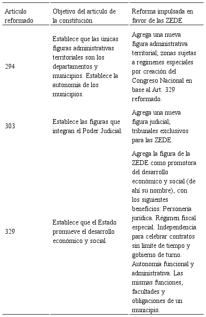 La figura de las ciudades modelo o ZEDE no está amparada por la Constitución de Honduras, por tal razón en el año 2013, a través de un decreto legislativo, se reformaron aquellos artículos que hacían inconstitucional esta figura territorial, como se puede apreciar en la Tabla 1. Con esto, la figura de los municipios y su autonomía es desplazada por este nuevo esquema territorial a nivel administrativo, financiero y judicial. Todo esto con la finalidad de dar un tinte de constitucionalidad a la nueva figura administrativa territorial nombrada ZEDE.