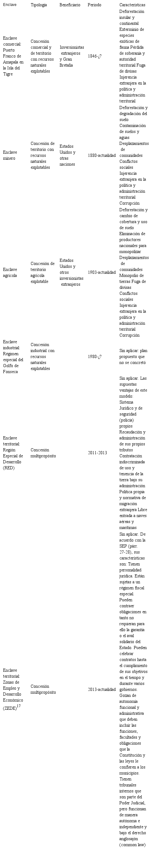 El concesionamiento territorial a inversionistas extranjeros a cambio de lograr el desarrollo económico y social de un país es la base de la teoría de la economía del enclave, muy conocida en el siglo XX y parte del siglo XXI. Al tabular la información resultante del presente estudio, se pueden apreciar la cantidad, tipos, periodos y características de los seis modelos de enclave que históricamente han existido o se han intentado crear en Honduras a través de la figura de la concesión del territorio (Tabla 2).
