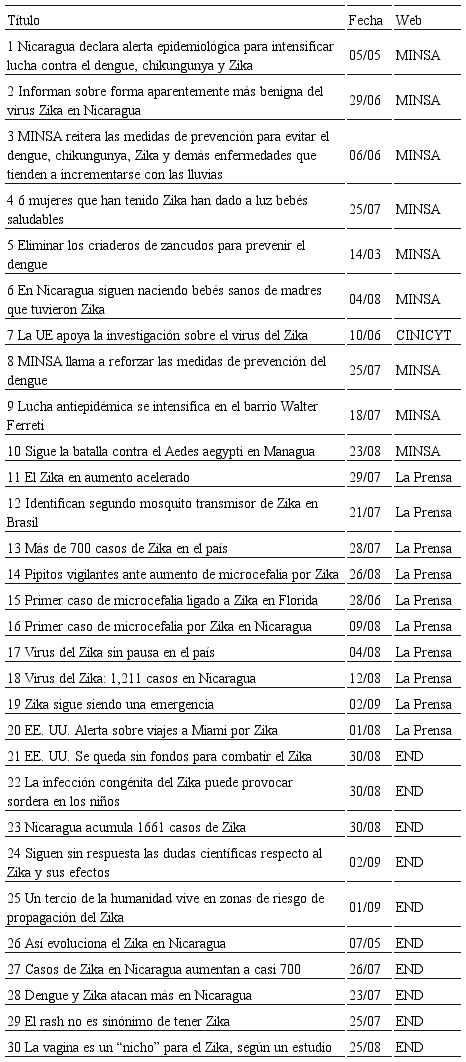 La muestra a analizar fue seleccionada a partir de cuatro criterios: en primer lugar, la fecha de publicación, que quedó comprendida entre el 14 de marzo y el 2 de septiembre del 2016; en segundo lugar, la temática de los textos, que se centró en la epidemia del zika; y, por último, la fuente y la vía de publicación, acotando los textos a los publicados en el espacio web por el GRUN y por los medios de prensa de mayor alcance en el espacio web en Nicaragua: END y LP.[10]