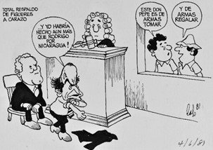 Costa Rica por otra parte, recibe tanto como EE. UU. el completo peso de la crítica de Hugo Díaz, para quien los presidentes costarricenses del periodo actúan con tolerancia al Somocismo y a la lucha anticomunista, en completa contradicción con la pretendida imagen de paz y neutralidad que se sostendrá con mayor fuerza a finales de la década de los 80, con los planes de paz liderados por Óscar Arias Sánchez. Los presidentes costarricenses Óscar Arias y Rafael Ángel Calderón, a pesar de que son presidentes en el lapso de estudio de esta investigación, no aparecen en caricaturas siendo vinculados a la discusión de la Revolución sandinista. Sí son retratados por otra parte, vinculados a discusiones que se llevan a cabo en la OEA, con relación a los procesos de paz en Centroamérica y con la designación de embajadores costarricenses en dicha institución. Vale la pena ampliar el análisis de esta temática en futuras investigaciones.