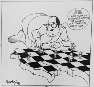 Díaz fue muy crítico con la postura contradictoria que toma Costa Rica en este conflicto: por un lado, parece declararse neutral en medio del conflicto, pero por otro lado no hace nada por detener la articulación de La Contra en la frontera Norte del suelo costarricense. Ejemplo de ello es la Figura 9: en ella Somoza se posiciona sobre el mapa de Costa Rica y comenta “Cho jodido ya es hora de empezar a mover los amigos que tengo en Costa Rica”. Esta es una crítica contra de la pretendida “neutralidad costarricense” frente al conflicto de la Revolución sandinista y Díaz llama la atención sobre el rol que juegan los políticos en no frenar el poder que fue amasando Somoza.
