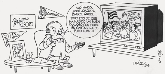 En la Figura 10, Díaz representa al entonces expresidente Luis Alberto Monge en Miami hacia 1994. Monge mira en el televisor la situación que se estaba desarrollando en torno al bloqueo económico de los EE. UU. frente a Cuba. Desde 1992, la potencia había estado implementado sanciones económicas contra Cuba como “The Cuban Democracy Act” de 1992. Lo que interesa de la caricatura con relación al personaje, es resaltar la pequeña bandera con la que Hugo Díaz adorna la habitación de Monge: sobre la cabeza del personaje se puede ver una bandera triangular que dice “CIACONTRA”. Esta decoración se asemeja a los souvenirs que coleccionan los seguidores de un equipo deportivo. En este caso el banderín, un motivo tan pequeño y simbólico presente en el dibujo, implica que Monge fue sino colaborador al menos fanático del “equipo” CIA-Contra.