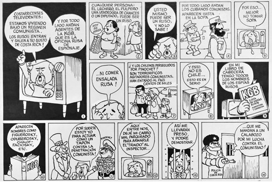 La Figura 11 es la única caricatura en la que se encuentra una referencia específica a la URSS en la región centroamericana. La imagen hace alusión a los imaginarios asociados a la paranoia anticomunista en los medios de comunicación, en este caso a través de la televisión, ya que en el dibujo un presentador de televisión insta a los costarricenses diciendo “los rusos entran y salen a su gusto de Costa Rica… en mi libro de cabecera tengo todos los nombres de los espías rusos aparecen nombres como Figuerosky, Oduberosky, Chalofaciosky, etc.”.
