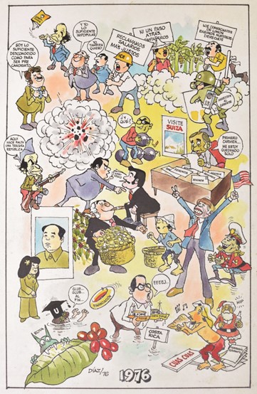 Por otra parte, en la siguiente imagen el artista realiza un resumen gráfico del año 1976. En este, Díaz representa los principales personajes asociados a las historias que circularon en prensa dicho año. Lo interesante es que esta caricatura es al mismo tiempo una introspección del propio artista sobre el trabajo que ha realizado y el contexto que ha estado comentando: este contexto que dibuja evidencia que el artista sabe que su producción artística está comentando un contexto de polarización profundo entre los EE. UU. y la URSS, incluso aparece un actor que no saldría con asiduidad en sus caricaturas: Mao Tse Tung.