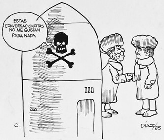 A su vez, otro tema que es central para el artista es la crítica a la carrera armamentista que se da a lo largo de la contienda de la Guerra Fría. Aunque no se registran caricaturas que involucren este tema con la Revolución sandinista, es importante revisar algunas caricaturas que representan la interacción entre EE. UU. y la URSS puesto que aportan elementos para entender la postura de Díaz sobre el conflicto nicaragüense. En ellas Díaz representa una compleja relación entre las potencias.