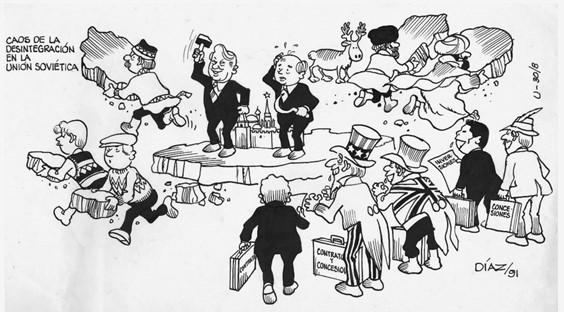 En la Figura 14, Díaz logra captar el sentimiento de desmoronamiento e incertidumbre. En el dibujo, Gorbachov mira como diversas personas toman trozos de su territorio y corren en direcciones opuestas: La URSS había sido desmembrada. Adicionalmente el Tío Sam y el Reino Unido identificados con las banderas y la iconografía usual, esperan su turno para reclamar los trozos de la antigua Unión Soviética. El mismo Gorbachov reacciona con sorpresa ante la escena donde se resquebraja su nación. En otra caricatura, Díaz hace otro comentario sagaz: en la Figura 15, Gorbachov mismo se trae abajo el Kremlin. Mientras tanto, atrás Reagan y Bush miran con maravilla como se cae el edificio y con este, el busto de Lenin. El líder ruso lo tumbó con un mazo que sostiene con la mano izquierda, mientras se come una hamburguesa con la mano derecha.