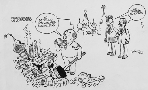 Para la época, Gorbachov había puesto en práctica dos políticas fundamentales que aceleraron la caída del gigante soviético: la Perestroika y la política del glasnot. La lectura que realiza Díaz de este acontecimiento puede ser entendida a la luz de lo que explica Hobsbawm, sobre los efectos que estas dos políticas tuvieron sobre la ex Unión Soviética, para el autor