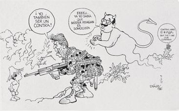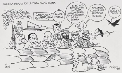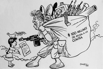 En las caricaturas, la siguiente administración del presidente Reagan es representada en las caricaturas de Díaz como un padrino fundamental del sostenimiento del movimiento contrarrevolucionario o “La Contra” en la frontera norte del territorio de Costa Rica. A razón de esto el historiador Hobsbawm afirma que