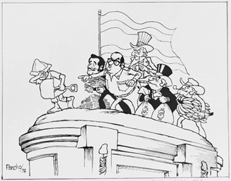 El anterior comentario se puede leer a la luz de la Figura 1, donde claramente Somoza es asociado con una noción de intromisión del capital extranjero y de depredación de los recursos de la nación. Además, este argumento apoya también metodológicamente la decisión de estudiar actores precisos de la palestra internacional vinculados a favor y en contra de la Revolución sandinista, ya que Díaz no parece caracterizar mucho al Frente Sandinista de Liberación Nacional sino que, por la naturaleza de la caricatura, escoge representar en general, a personajes fáciles de reconocer asociados al movimiento: Carlos Fonseca (uno de los fundadores del Movimiento Sandinista) principalmente y el sacerdote Ernesto Cardenal por ejemplo. El artista dedica más tiempo y espacio a representar a los protagonistas del conflicto y a los poderes internacionales vinculados con la Guerra Fría.