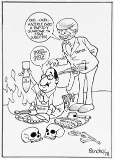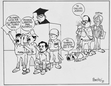 El entonces presidente de los EE. UU. se limita a sonreír y cargar un libro con la inscripción “DD. HH.” o Derechos Humanos. De esta manera una y otra vez Díaz hará alusión a la conocida política de supuesta promoción de los derechos humanos de la administración de Carter. Sin embargo como se verá más adelante Díaz es crítico de esta postura, porque si se mira detenidamente el arma con el que Somoza mantiene en el suelo al “pueblo nica”, esta lleva una inscripción que dice “Made in USA”: claramente haciendo alusión a la contradictoria postura de los EE. UU. quienes durante la Guerra Fría reiteradamente sostuvieron una política de no intervención, mientras que al mismo tiempo financiaron la militarización de movimientos anticomunistas, y en el caso de la Revolución sandinista el movimiento de La Contra. En los albores de la década de los ochenta, la tensa relación entre Nicaragua y los Estados Unidos estaba cerca de un punto de ruptura inminente, cuando los sandinistas comienzan a enviar ayuda a los revolucionarios de El Salvador, según Powaski: