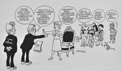 Adicionalmente, como afirman Padilla y Ramírez sobre las imágenes que circularon en Europa con relación a las luchas armadas en Centroamérica, es claro que tanto los abanderados del capitalismo como aquellos afines a la lucha comunista pusieron en práctica retóricas visuales que fueron determinantes en el combate de la Guerra Fría, para “lo cual era necesario el uso de símbolos identificables para otra cultura, que dieran paso al mensaje connotado deseado” (Padilla y Ramírez 17). En este caso, en la retórica visual de Díaz pareciera ser que su apoyo al Sandinismo está implícito en las caricaturas. Por otro lado, Díaz no establece un vínculo intelectual entre el Sandinismo y el proyecto soviético, sino que casi que trata de darle una independencia ideológica y de caracterizarlo a través de sus opositores.