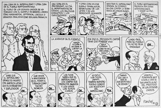 En este sentido, la presencia imperialista de Estados Unidos queda bien clara en las obras que realiza Díaz sobre la Revolución Sandinista y el papel que juega Costa Rica en ese proceso. En ellas encontramos una lectura hiperbólica sobre la cruel y aplastante presencia del Tío Sam en la vida política de los países centroamericanos. La complejidad y riqueza de estas obras reside no solo en su enfoque satírico sino en el componente contextual de su lectura, lo que las hace fácil de entender e interpretar para el lector.