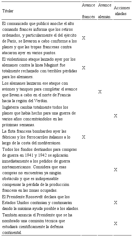 Los subtítulos confirman la intencionalidad del diario: de los ocho apartados principales de la primera página, solo uno hace referencia al avance alemán y siete confirman el progreso de los franceses o las acertadas acciones de los aliados (Tabla 1).