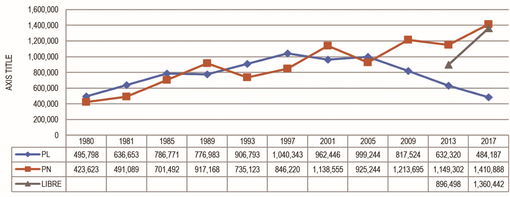 El viejo e histórico bipartidismo, conformado por el Partido Liberal y el Partido Nacional sufrió un duro revés después del golpe de Estado del 28 de junio de 2009, sobre todo por la fragmentación e implosión del Partido Liberal, que pasó a ser una tercera fuerza política, después de ser la fuerza política principal gobernante desde 1980 hasta el 2009. En este periodo se realizaron ocho procesos electorales, uno para la Asamblea Nacional Constituyente y siete para cargos de elección popular, de los cuales el Partido Liberal ganó seis procesos electorales, el de la Asamblea Nacional Constituyente y cinco para cargos de elección popular. Pero mientras el Partido Liberal salió muy fragmentado del golpe de Estado del 28 de junio de 2009, el Partido Nacional salió fortalecido porque aunque participó activamente en el golpe de Estado, le favoreció que no estaba gobernando. Así que logró desmarcarse del mismo y mantener sus bases sociales intactas. Así las cosas, las elecciones generales de 2013 y las de 2017 se realizaron en un proceso de reconfiguración del sistema de partidos políticos y sus resultados modificaron la geografía electoral (Figura 1).