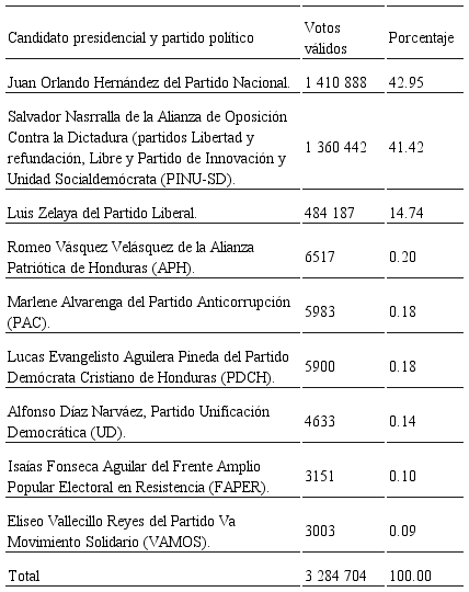 Dos, el monitoreo de la cobertura de la campaña de los medios revela un fuerte desequilibrio entre candidatos en favor de Juan Orlando Hernández. En la propaganda pagada, Juan Orlando Hernández obtuvo una visibilidad mucho mayor (64 %) que la de sus principales competidores Salvador Nasralla (15 %) y Luis Zelaya (17 %), mientras que los demás candidatos no sobrepasaron en conjunto el 4 %. En los programas de noticias, se observó también una presencia promedio del candidato del Partido Nacional del 44 %, muy por encima del 21 % de Nasralla, del 10 % de Luis Zelaya y del 25 % de los otros candidatos.[15]