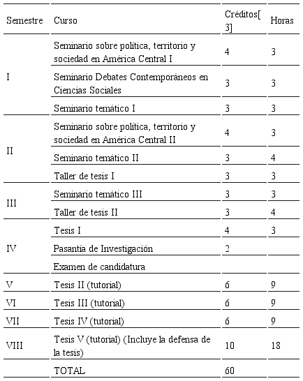 La estructura curricular incluye seminarios de discusión acerca del desarrollo social de Centroamérica, seminarios temáticos y talleres de formulación metodológica de proyectos. Ello se acompaña con la investigación empírica, la cual supone una inmersión densa en la región a través del trabajo de campo. Ello estará acompañado de una estancia de investigación fuera de la región, luego de la aprobación del cuarto semestre y del proyecto de investigación doctoral o examen de candidatura, ello con el fin de que la persona socialice en un entorno académico de alto nivel y pueda contestar preguntas de su tesis en diálogo con recursos bibliográficos del debate internacional. Los últimos tres semestres corresponderían al trabajo de campo y la redacción de la tesis.[1]