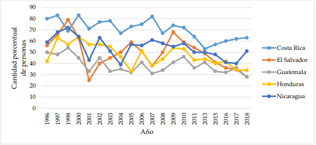 No obstante, se puede apreciar radiografías muy completas de la cultura política de los centroamericanos en los estudios de opinión pública más famosos de la región,5 los cuales se realizan periódicamente. En los reportes regionales de LAPOP destacan desde 2004 las valoraciones sobre participación política, gobernabilidad, gobierno local, legitimidad política, estabilidad democrática, democracia electoral, libertades básicas, instituciones y legislación, así como las orientaciones democráticas en conjuntos regionales. Mientras que en los estudios del Latinobarómetro desde 1995 destacan las valoraciones de los centroamericanos sobre la democracia, la satisfacción con el Congreso y los partidos políticos, la representación política, las actitudes hacia el autoritarismo, la representación política, el Estado y el interés en la política.