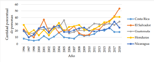 El Salvador destaca en los datos de la indiferencia hacia la democracia, posiblemente por la monopolización del debate político entre las dos herederas partidarias de la guerra interna en el país. Eso se aduce en virtud de que los datos más altos que se registran son en 2001, 2016, 2017 y 2018. El dato de 2001 coincide con el programa fallido del presidente Flores para acabar con la inseguridad y con las dificultades institucionales para superar los desastres que ocasionó el Huracán Mitch que agudizaría las condiciones de pobreza. Un año antes, las instituciones que se dedican a estudios de población20 habían registrado que el 49,8 % de la población vivía en pobreza y el 21,9 % en pobreza extrema.