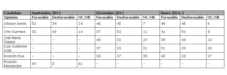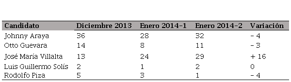 A finales de octubre, los sondeos de opinión sugerían que la contienda se definiría entre Araya (PLN), Otto Guevara (Movimiento Libertario, ML) y José María Villalta (FA). Los candidatos Luis Guillermo Solís (PAC) y Rodolfo Piza (PUSC) se perfilaban en un cuarto y quinto lugar, respectivamente, hasta enero del 2014. Como se aprecia en la Figura 1, las diversas encuestas entre agosto y octubre del 2013 registraron que el vacío que dejó el candidato del PUSC Rodolfo Hernández, fue suplantado por Otto Guevara (ML) y por el candidato del FA José María Villalta. Estos dos candidatos, junto a Araya (PLN), tuvieron un empate técnico en las encuestas de la empresa Unimer de diciembre del 2013 (Oviedo, 2013) y en enero del 2014 (Oviedo, 2014), donde Villalta fue el candidato favorito por un margen de 2.5 % y 1.9 %, respectivamente. Por otra parte, se aprecia que entre diciembre y enero las encuestas mostraron una caída en la hegemonía del candidato oficialista Johnny Araya.