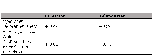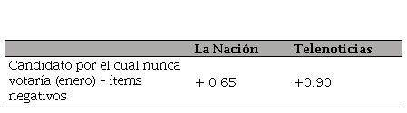 En el caso de la polarización de actitudes, tomando el valor de la segunda encuesta de enero (más cercana a los comicios, más representativa de un efecto agregado de la cobertura de los medios de comunicación), la correlación fue más fuerte en relación con las notas de tono negativo publicadas por Telenoticias que las publicadas por La Nación, como se evidencia en la Tabla 12.