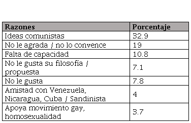 Sin embargo, el auge de personas que tomaron una posición en contra de Villalta parece estar más influido por el énfasis en los subtópicos mencionados en el apartado anterior. Como se desprende de la encuesta realizada del 5 al 15 de diciembre del 2013, hecha por CID Gallup, la mayoría de quienes expresaron que nunca votarían por Villalta justificó su respuesta con su ideología.