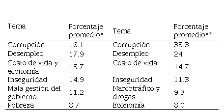 Este reto metodológico obliga a evaluar los resultados para ambas encuestas por separado. Como se observa en la Tabla 1, en términos generales, la jerarquía temática expresada en las encuestas de opinión pública concuerda en ambas mediciones, siendo los cuatro temas de mayor importancia casi idénticos.