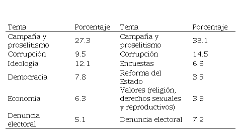 Por otra parte, los resultados de la cobertura mediática de La Nación y Telenoticias mostraron similitudes considerables. Como se desprende de la Tabla 2, en ambos medios –y como es de esperarse en contextos electorales (Crigler et al.)– la temática predominante fue la categoría “Campaña y proselitismo”, que reúne las notas publicadas en torno a visitas de los candidatos, agenda de actividades, adhesiones a candidaturas y controversias retóricas entre personalidades relevantes de los partidos. También en ambos casos, el tema de corrupción ocupó un significativo lugar.