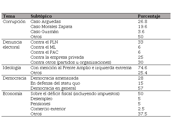 A su vez, la categoría “Democracia” presentó dos variables importantes: los artículos que alertaban sobre una inminente amenaza sobre la democracia –indirectamente referida a un eventual triunfo de Villalta– y los que defendían el statu quo frente a la incertidumbre del cambio. Los dos subtópicos reunieron un 43 % de las notas publicadas bajo la categoría “Democracia”. Por otra parte, al hablar de temas económicos, La Nación hizo especial énfasis en el déficit fiscal, una preocupación importante que apenas empezaba a discutir el gobierno en aquel momento.