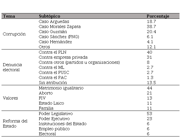 En el caso de Telenoticias, las notas relacionadas con corrupción también dominaron la pauta y se enfocaron en los casos de Jorge Arguedas (FA) y de Víctor Morales Zapata (PAC); concentraron 57.4 % de las notas, como se puede ver en la Tabla 4. Por otra parte, en el tema de denuncia electoral, el subtópico dominante fue sobre las denuncias contra el PLN y contra la empresa privada. En el caso de la categoría “Valores”, el subtópico principal fue el matrimonio igualitario, seguido por el aborto.
