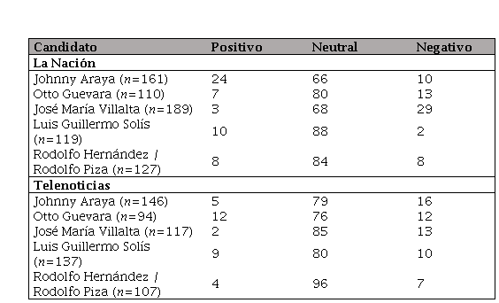 Como se puede apreciar en los resultados en la Tabla 5, ambos medios trataron a los candidatos de diferente forma. Mientras que casi un tercio de los artículos publicados por La Nación en referencia a José María Villalta fue negativo, una cantidad similar de artículos sobre Johnny Araya fue positiva. En el caso de Telenoticias, Johnny Araya recibió mayor cobertura con tono negativo, aunque no fue mucho mayor que los demás candidatos. En el caso de Luis Guillermo Solís y Rodolfo Piza, destaca la poca cobertura con tono negativo que recibieron, lo cual está probablemente relacionado a su posición en las encuestas, pues gozaron de mayor cobertura neutral.