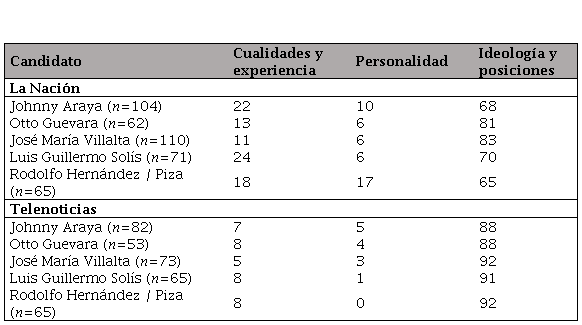 En cuanto a los atributos sustantivos, en todos los casos la mayoría de la cobertura se centró en la ideología y posiciones de los candidatos. Cabe resaltar que, en el caso de Johnny Araya, hubo un énfasis significativo en sus cualidades y datos biográficos, tanto en La Nación como en Telenoticias. Destaca también el énfasis que hicieron ambos medios en la ideología y posiciones de Otto Guevara y José María Villalta.