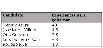 La Tabla 6 muestra que el candidato cuyas cualidades y experiencia fueron más visibilizadas por La Nación es Johnny Araya. Por otra parte, en las ediciones de Telenoticias se resaltó esas para casi todos los candidatos por igual, exceptuando a Villalta, que recibió menos menciones vinculadas a sus cualidades y su trayectoria biográfica. Eso contrasta con la encuesta de CID Gallup de diciembre del 2013 (Tabla 7), donde se consultó a las personas encuestadas cuál candidato consideraban que tenía más experiencia para gobernar.15
