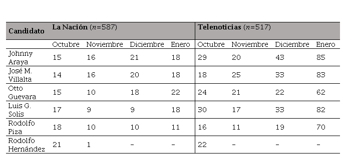 Como se aprecia en la Tabla 8, el candidato cuya imagen apareció más en el diario La Nación fue Johnny Araya (70) seguido muy de cerca por José María Villalta (69) y Otto Guevara (68). Sin embargo, en el caso de Telenoticias, el candidato oficialista (177) fue seguido por Luis Guillermo Solís (162) y después José María Villalta (159). La variación se debe principalmente al aumento de ítems que presentaron la imagen de Luis Guillermo Solís durante los meses de diciembre y enero, lo que coincide con el auge del candidato en las encuestas.