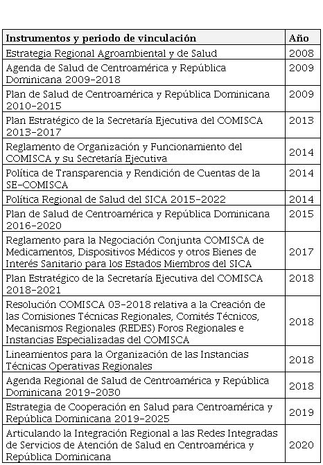 Por ende, se comprometieron con alcanzar el desarrollo sostenible de la población centroamericana, a través de la tolerancia política, la convivencia democrática y el crecimiento económico con el progreso social, garantizando el sano funcionamiento de los ecosistemas vitales para la vida humana, a partir de un diálogo efectivo, que facilite a los gobiernos y a todos los sectores de la sociedad actuar solidariamente (SICA, 1995, Art.º 8, inciso a). Como órgano subsidiario, el COMISCA introdujo desde 2008 propuestas pertinentes a todas las naciones, al identificar y priorizar los problemas sanitarios regionales (Tabla 1). Institucionalmente, acoge la visión de “ser la instancia regional clave en la articulación intersectorial, en el marco de la determinación social de la salud, mediante la gestión del conocimiento y de la cooperación para el desarrollo sostenible de la región” (SICA, 1995). Tiene por misión “apoyar a los Estados miembros en su función de garantizar los derechos ciudadanos para el acceso, cobertura universal y calidad de los servicios de salud” (SICA, 1995). Entre sus principios institucionales, se encuadran la excelencia, el compromiso, la solidaridad, la equidad y la ética.