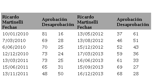 Martinelli mantuvo una alta aprobación. La excepción fue el período que abarcó desde septiembre de 2011 a agosto de 2012 que coincide con la etapa posterior al quiebre de la coalición gubernamental. Luego su popularidad repuntó hasta niveles que en Panamá no tenían precedentes. En la parte final de su gobierno era reconocido por las obras públicas que había llevado a cabo y por presumir de buenos números en variables macroeconómicas, como crecimiento, desempleo y pobreza, aunque no en inflación (Barragán, 2016).