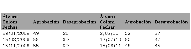 Coincidentemente, el mandato de Álvaro Colom (2008-2012) se caracterizó por aumentar los programas y recursos públicos dirigidos a poblaciones en condiciones de pobreza y pobreza extrema especialmente en las zonas rurales, sin menoscabo de la perspectiva clientelar. Durante su gestión la población entre 15 y 29 años resultó beneficiada por el avance de las capacidades educativas. También se reportaron avances en la gratuidad de los servicios públicos. A su vez, durante la administración la deuda pública aumentó en modo alarmante. Guatemala se ubicó entre los países latinoamericanos con mayor tasa de homicidios y se incrementaron las evidencias de cooptación de las instituciones públicas por el narcotráfico y la percepción de corrupción (Lautaro, 2012). De acuerdo con las mediciones el mandatario Álvaro Colom a lo largo de su mandato mantuvo una percepción ciudadana positiva indiscutida (Tabla 11). No obstante, la desaprobación del desempeño presidencial se incrementó de manera notable en la medida que se acercaba la campaña electoral de 2011 asociado probablemente con la agudización del clima de inseguridad ciudadana y la designación de la primera dama, Sandra Torres, como candidata presidencial de UNE (Tabla 9).