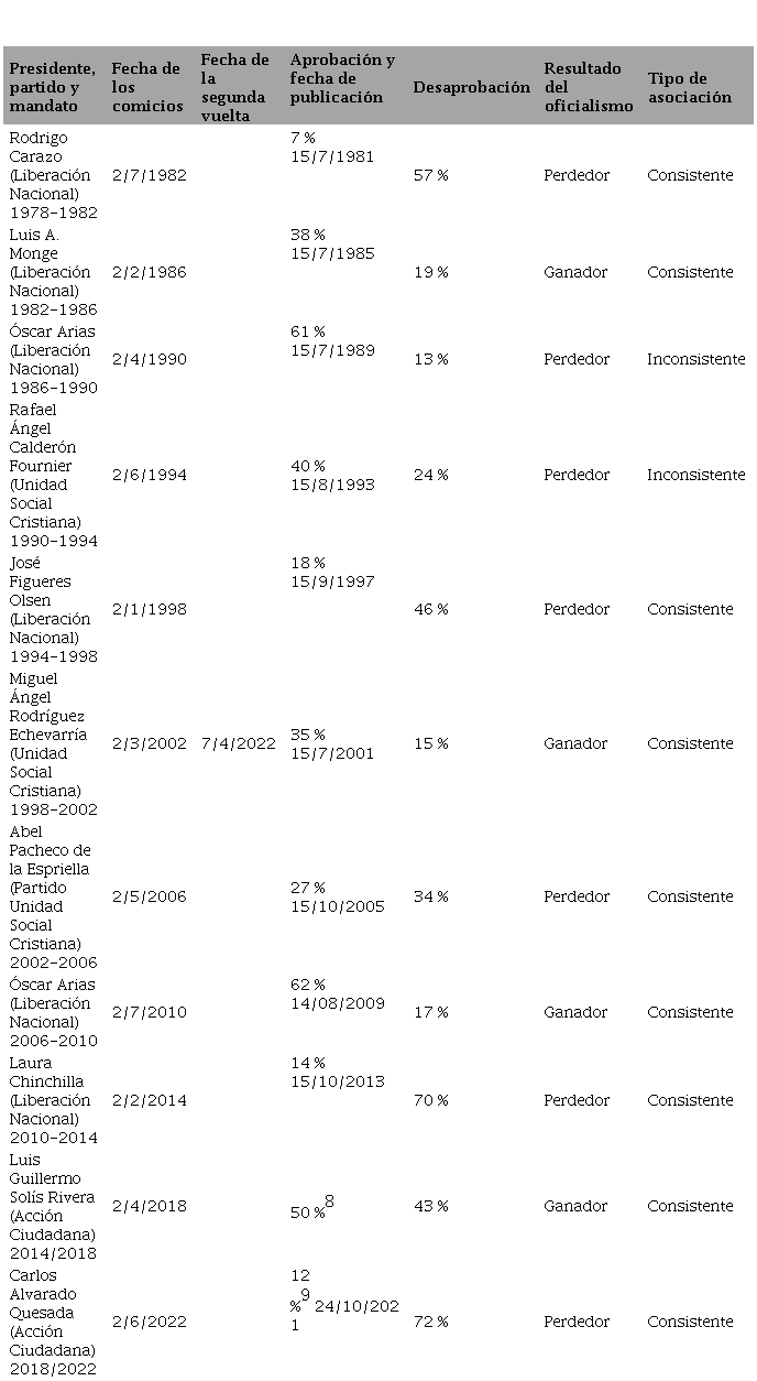 Los comicios costarricenses de 1990 representan la experiencia latinoamericana más temprana de divorcio entre aprobación presidencial positiva y voto por el oficialismo. Cuatro años más tarde, en 1994, una dinámica similar afectaría a la fuerza política que emergió vencedora en 1990, el PUSC. Aunque en sus últimos dos años de gestión el gobernante social cristiano, Calderón Fournier, consiguió enderezar su imagen (40 % aprobación y 24 % desaprobación) propulsado por índices favorables de crecimiento económico (Furlong, 1994) tampoco la percepción ciudadana favorable de su desempeño resultó suficiente para evitar la derrota oficialista y la alternancia en el poder. Desde entonces, en Costa Rica se han celebrado siete elecciones presidenciales sin que volvieran a reditarse experiencias como las de 1990 y 1994. Desde 1998 y hasta 2022 la conexión entre aprobación y voto ha vuelto a ser estable (Díaz, 2022).