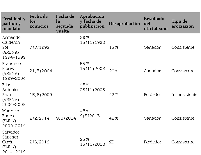 No obstante, en ninguno de los dos casos el hecho de que el oficialismo acreditara una evaluación ciudadana favorable del desempeño presidencial durante el mandato constitucional pudo asegurar su continuidad. Por último, en los comicios presidenciales de 2009 en El Salvador el mandatario Elías Antonio Saca encabezaba el cuarto gobierno sucesivo de la conservadora Alianza Republicana Nacionalista (ARENA). Al igual que los presidentes areneros que le precedieron en el cargo Saca contaba con una aprobación ciudadana positiva de su gestión. Sin embargo, por primera vez el candidato presidencial de ARENA resultó derrotado por el del Frente Farabundo Martí para la Liberación Nacional (FMLN), Mauricio Flores. Centroamérica reporta significativamente más casos de falta de asociación entre la aprobación presidencial positiva (APP) y el resultado electoral del oficialismo que el resto de Latinoamérica. Con la excepción de Costa Rica y Panamá, los regímenes presidencialistas de la región constituyen democracias de baja calidad atravesadas por procesos de erosión gradual de ese tipo de sistema político. A su vez, en la región la figura de la reelección presidencial inmediata se encuentra, por regla general, constitucionalmente prohibida.