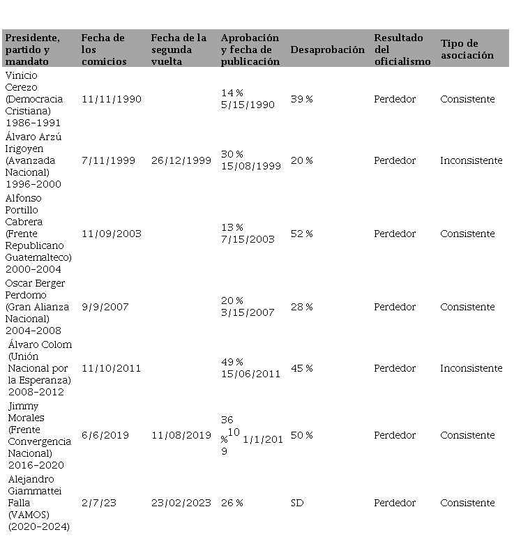 En los procesos electorales celebrados en dos vueltas, los resultados de la primera etapa no fueron considerados, salvo cuando el oficialismo resultó eliminado en esa instancia. Por último, no tomamos en cuenta los comicios presidenciales de 1995 en Guatemala antecedidos por una interrupción del mandato constitucional. En interés de la homogeneidad no debían coincidir en la muestra gobernantes con mandatos concluidos con ejecutivos con mandatos inconclusos.