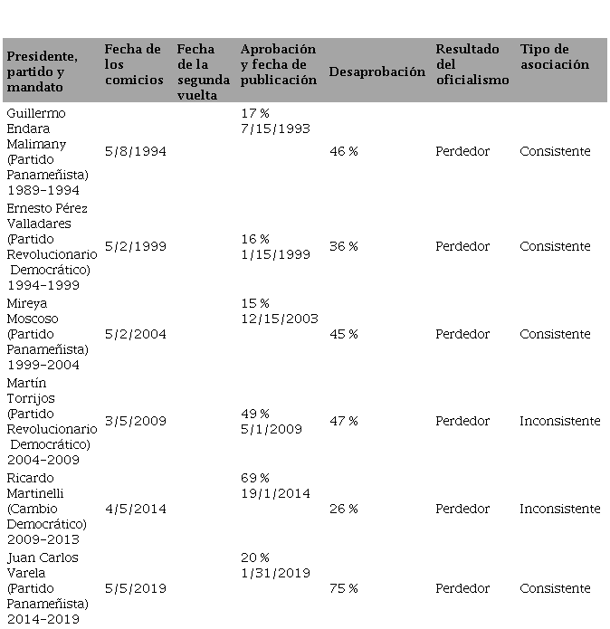 Al igual que Costa Rica, Guatemala registra también dos casos de inconsistencia. Los mandatarios Álvaro Arzú Irigoyen (1996-2000) del Partido de Avanzada Nacional (PAN) y Álvaro Colom (2008-2012) de Unión Nacional de la Esperanza (UNE) contaron con una percepción ciudadana favorable de su gestión. Ambos son los dos únicos presidentes guatemaltecos con esas credenciales. Pero, tanto el PAN como UNE no pudieron capitalizarlo truncándose su continuidad en el poder en los comicios presidenciales de 1999 y 2011, respectivamente. Por su parte, en Panamá los presidentes Martin Torrijos (2004-2009) del Partido Revolucionario Democrático (PRD) y Ricardo Martinelli (2009-2014) de Cambio Democrático (CD), también alcanzaron evaluaciones positivas. Si bien, la diferencia entre la aprobación y la desaprobación de Torrijos era ajustada (49 % vs. 47 %) la que alcanzó a exhibir Martinelli fue abrumadora (69 % vs. 26 %).
