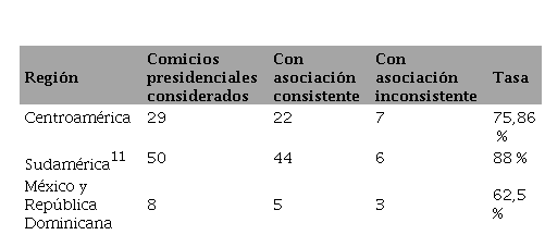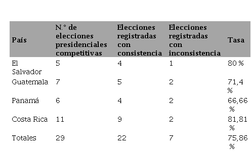 En ese escenario, la consistencia de la tasa centroamericana de AAVO se incrementa de 75,86 % a 81,48 %. Dicha operación la aproxima al comportamiento de la tasa sudamericana (88 %); en realidad es mucho más representativa de la consistencia evidenciada por esa pauta de comportamiento en la región. La diferencia de aproximadamente seis puntos porcentuales que se aprecia entre ambas tasas probablemente se encuentre asociada con la presencia o no del mecanismo de la reelección presidencial inmediata. Mientras en Centroamérica, como regla, la figura se encuentra constitucionalmente prohibida, la situación es diferente en varios de los países sudamericanos en las que las elecciones tienen lugar en un entorno competitivo y transparente como, por ejemplo, Brasil, Argentina, Colombia y Ecuador.