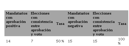 No obstante, se han registrado casos paradigmáticos de no consistencia entre aprobación y voto por el oficialismo. Cuando los mandatarios de turno arriban a la campaña electoral con una evaluación ciudadana de su desempeño satisfactoria, como regla tiene lugar un generoso traspaso de esa popularidad en caudal de votos para el candidato presidencial del POCG. Sin embargo, en ocasiones la dinámica no se ha producido. Probablemente, el caso más emblemático se presentó en los comicios presidenciales chilenos de 2009 y 2010. Entonces la mandataria Michelle Bachelet gozaba de una altísima evaluación (78 %) que parecía augurar la continuidad en el poder del oficialismo por intermedio de su candidato el expresidente Eduardo Frei Ruiz-Tagle. Pero, el triunfo de la oposición centroderechista en las urnas liderada por el entonces candidato presidencial Sebastián Piñera abortó una tendencia que antes de la celebración de los comicios muchos consideraron incontenible (Espinoza, Morales y Perelló, 2009). Resultó un quiebre paradigmático.