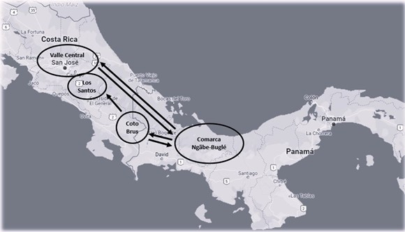 Muchos aprovechan para hacer una ruta entre diferentes fincas y localidades y así aprovechar al máximo la temporada de cosecha. Si bien inicialmente solo llegaban a la zona sur y se quedaban ahí hasta regresar a la Comarca, a lo largo de los años empezaron a desplazarse también a la zona de Los Santos, y el Valle Central, realizando a veces una ruta escalonada a la que algunos ya llaman la “ruta ngäbe” (Entrevista a Xinia Chaves, Directora Ejecutiva ICAFE, 20 de diciembre 2021), o “Ruta de la Migración Ngäbe-Buglé” (Borge, 2021), que consiste en estar unos meses en el sur donde se da la maduración temprana y posteriormente desplazarse más al norte y noroeste para incorporarse en la cosecha de esas regiones (Figura 2).