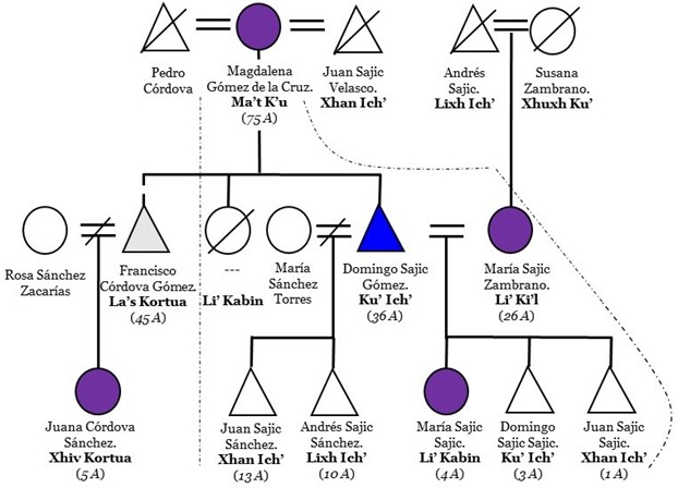 Ma’t K’u tuvo dos hijos y una hija. La’s K’u o Francisco Córdova Gómez –ilustrado con un triángulo gris– nació en 1929 y su padre era Pedro Córdova.11 Ku’ Ich’ –triángulo azul– fue registrado como Domingo Gómez y nació el 17 de marzo de 1935.12 Su padre, Xhan Ich’, fue alcalde municipal de Cotzal y también trabajó como contratista para las fincas.13 Asimismo, Ma’t K’u tuvo una hija llamada Li’ Kabin, nombre que años después recibiría la hija de Ku’ Ich’ como su ch’exel o tocaya.