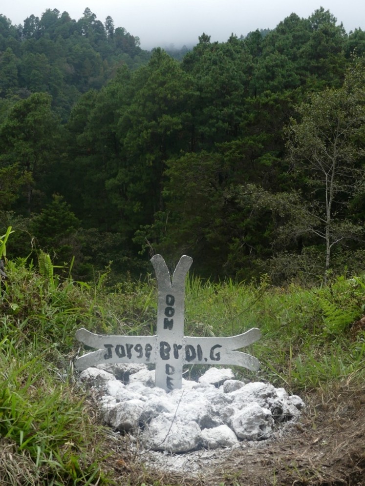 De acuerdo con Xhiv Kortua, un hombre k’iche’ manejaba el automóvil de Jorge Brol cuando “unas personas de piel morena [moreno q’u vinaj]” le dispararon y robaron Q8000. Ku’ Ich’ era de tez blanca y ojos claros, por lo que el chofer negó su participación en el asesinato. De acuerdo con la denuncia de Edmundo Brol,28 el chofer se llamaba Domingo Vicente Pastor y también había sido encarcelado como sospechoso. Por el asesinato de su hermano, Edmundo Brol acusó a Domingo Sajic, Pedro Medina y otras dos personas. La Figura 3 muestra el lugar donde fue asesinado Jorge Brol en 1969 en el camino entre San Felipe Chenlá y Jaq Vintav.